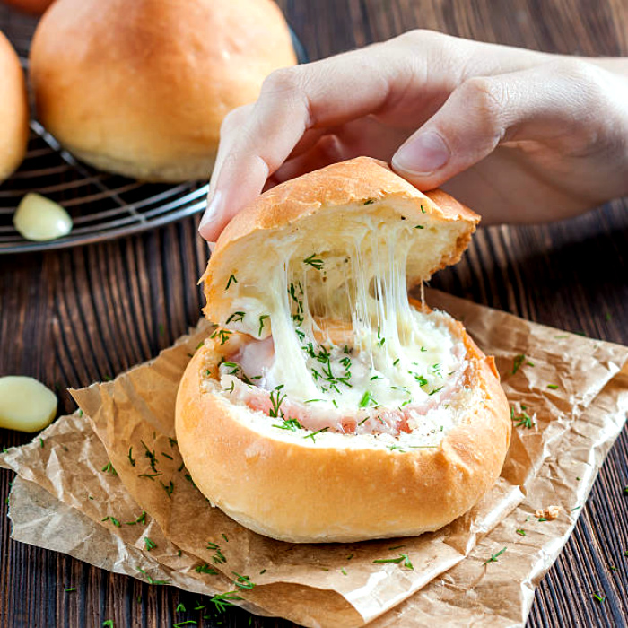 Возьмите свежую булочку для бургеров, срежьте ее верхушку и аккуратно выньте мякоть. На дно и стенки булочки выложите ветчину или бекон, сыр, вбейте яйцо, посолите, поперчите, посыпьте мелко натертым сыром и накройте ранее срезанной верхушкой.