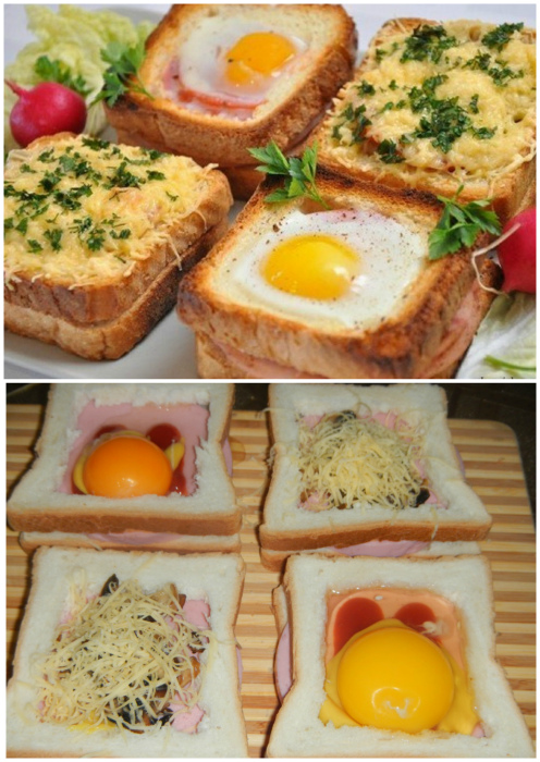 Вкусные, необычные и очень сытные бутерброды с колбасой, сыром, грибами и яйцом — прекрасное блюдо для начала дня. Для приготовления такого завтрака понадобится тостовый хлеб, колбаса, сыр, грибы и несколько яиц. Подготовьте ломтики хлеба, покройте его тонкими кружочками колбасы, покройте куском хлеба с вырезанной серединкой. В импровизированные рамочки выкладываем порезанные грибы, ломтик помидора и посыпаем сыром. В другие бутерброды вбейте по яйцу и отправляйте в разогретую духовку. Как только сыр расплавиться, а белки схватятся — доставайте бутерброды и подавайте к столу.