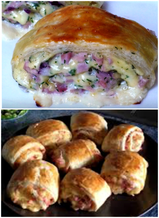Оригинальные рулетики из слоенного теста с начинкой из сыра и ветчины — прекрасная закуска, которая придется по душе как взрослым, так и детям. Для приготовления необычных рулетов понадобиться небольшой кусок слоенного теста, который нужно раскатать так, чтобы получился прямоугольник, всю поверхность которого нужно застелить тонкими кусочками ветчины и сыра. Тесто с начинкой следует скрутить в плотный рулет и аккуратно разрезать на маленькие кусочки. Получившиеся рулетики нужно поместить в смазанную подсолнечным маслом форму для выпечки, полить их глазурью из растопленного сливочного масла, горчицы и сахара, и оправить в предварительно разогретую духовку. Запекать рулетики следует при температуре 175 градусов в течении 20-25 минут.
