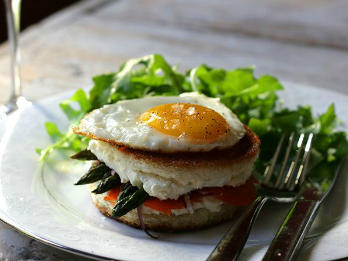 Вкуснейший сэндвич с козьим сыром, тонкими ломтиками копченного лосося, спаржей и жаренным яйцом — аппетитное и питательное блюдо для аристократического завтрака.