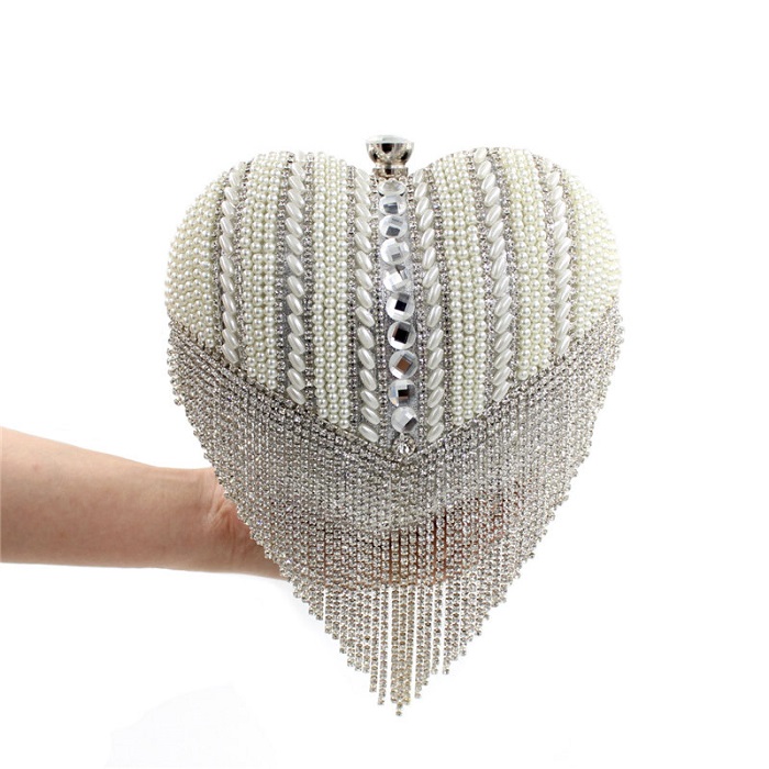 Свадебная сумочка в виде сердца, украшенная жемчугом и бахромой из серебра