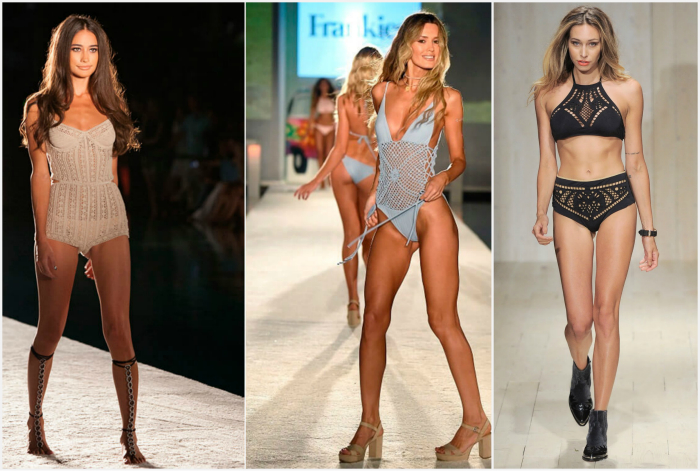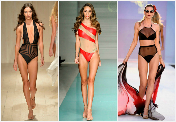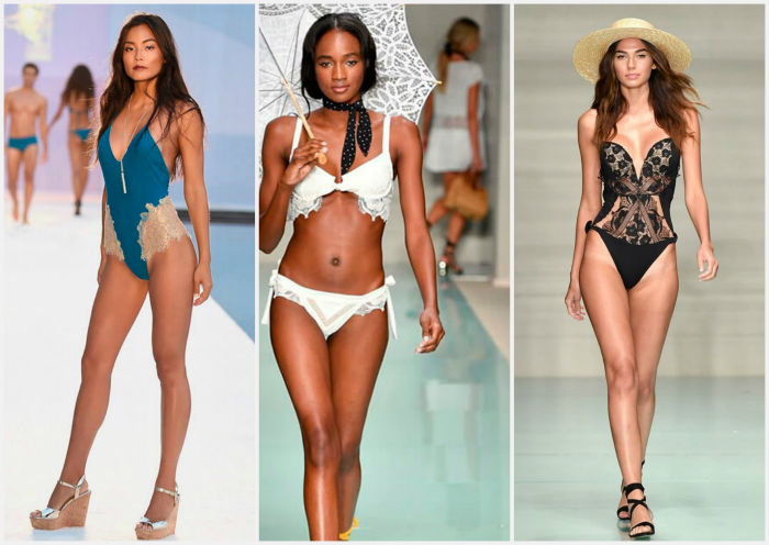 Девушкам без комплексов, а также всем тем, кто успел привести тело в форму к лету, наверняка придутся по душе соблазнительные купальники с полупрозрачными вставками из гипюра и кружева.