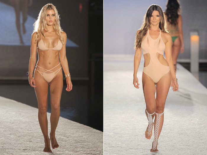 На ровне с яркими цветами в моду вошли купальники телесного цвета, которые прекрасно смотрятся на загорелом теле и создают иллюзию обнаженности.