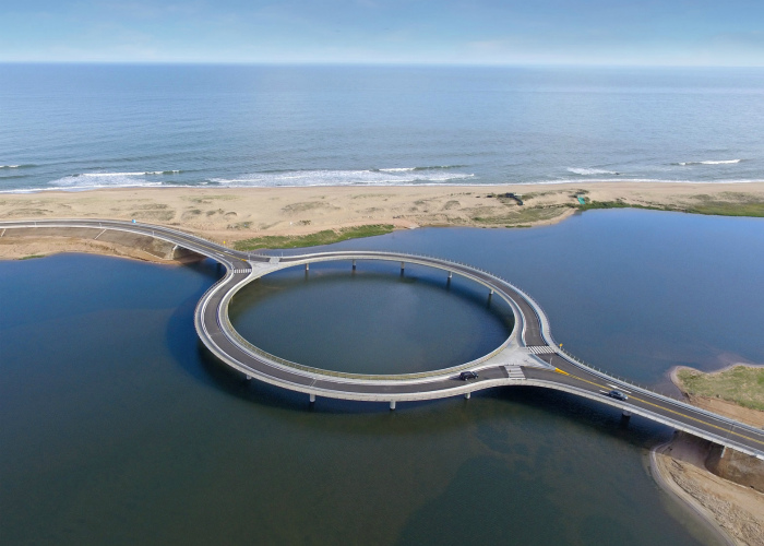 Неординарный мост в Уругвае, выполненный в виде кольца, конструкция которого должна заставить водителей снизить скорость на этом участке дороги.
