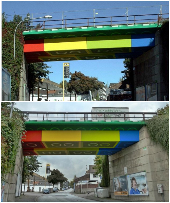 Яркий балочный мост, который пересекает Швестерштрассе в городе Вупперталь в Германии, покрашенный в стиле деталей популярного конструктора.