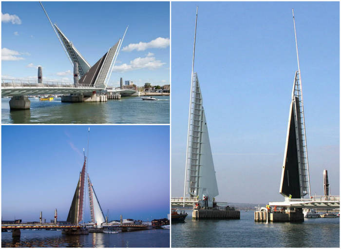 Потрясающий разводной мост, соединенный по диагонали, части которого в поднятом виде выглядят, как два прекрасных парусника.