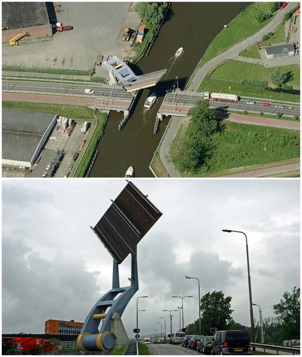 Подъемный мост Slauerhoffbrug в Нидерландах представляет собой квадратную платформу, похожую на катапульту, размером 15 метров в длину и столько же в ширину, которая соединяет два участка дороги.