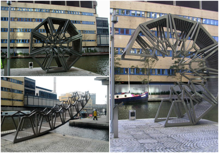 Оригинальный пешеходный мост, который благодаря мощной гидравлической поршневой системе, способен скручиваться в восьмиугольник, позволяя пройти грузовым и пассажирским суднам. После этого конструкция вновь разворачивается, давая дорогу пешеходам.