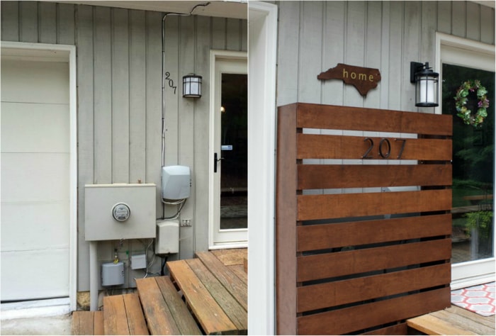 Дверца-экран, сделанная из широких деревянных реек, поможет не только скрыть от посторонних глаз электропровода, счетчики и электроавтоматы, находящиеся на фасаде, но и улучшить внешний вид дома.