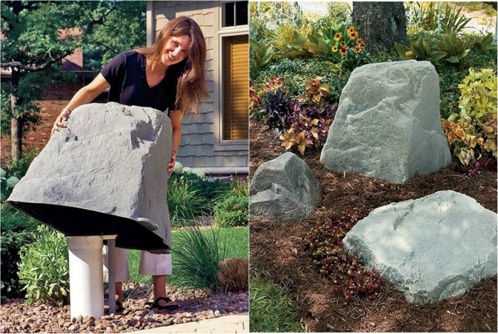 Оригинальные футляры в виде больших и маленьких валунов помогут скрыть неприглядную сантехнику, станут надежными тайниками для ценных вещей, а также оригинальными элементами ландшафтного дизайна.
