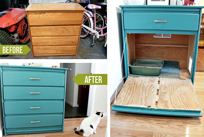 Переоборудованный комод с откидной дверцей станет прекрасным местом для хранения кошачьего лотка и позволит скрыть этот не слишком эстетичный предмет.