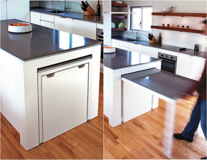 Кухонный островок со встроенным выдвижным столиком, который обеспечит кухню обеденной зоной и дополнительной рабочей поверхностью.