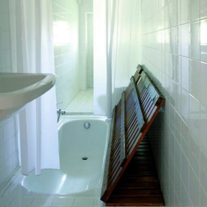 Прочная крышка из широких деревянных реек поможет скрыть встроенную в пол ванну.