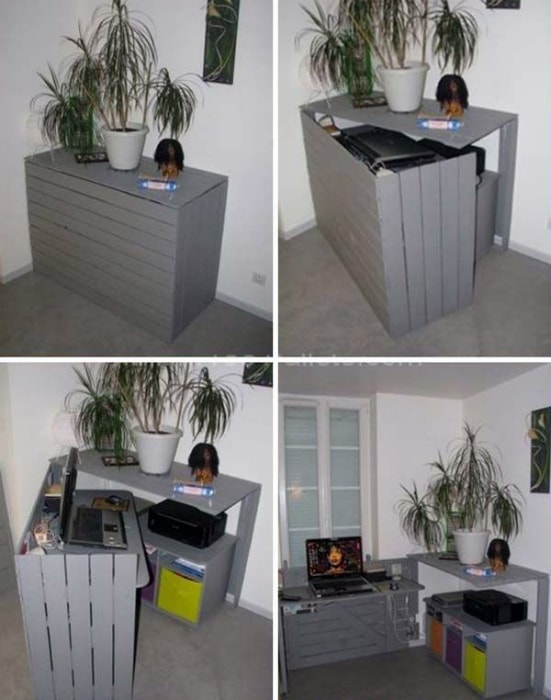 Оригинальная тумба-трансформер, сделанная из паллет, которая при необходимости превращается в двойной угловой стол.
