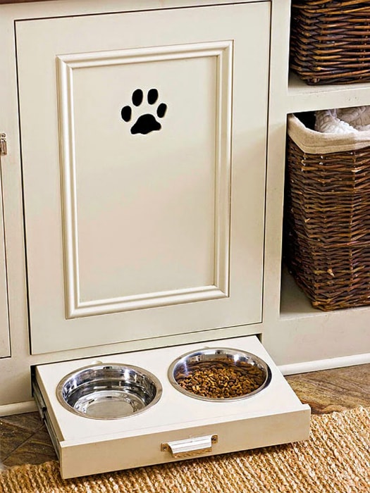 Специальный шкафчик, оборудованный выдвижной ступенькой с ячейками для мисок домашнего любимца. Ожидая гостей или наводя порядок в дому, ступеньку можно задвинуть, а сам шкафчик использовать для хранения мешков с кормом, лакомств, игрушек, ошейников и поводков.