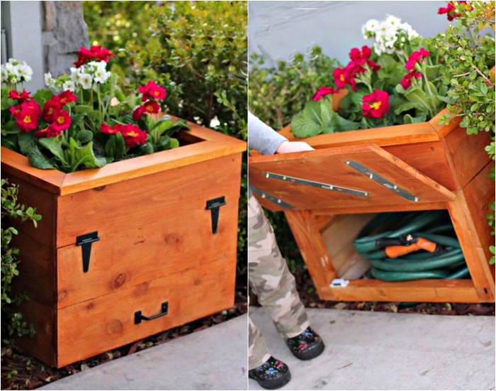 Очаровательная деревянная клумба с небольшим скрытым шкафчиком, который прекрасно подойдет для хранения шланга или мелкого садового инвентаря.