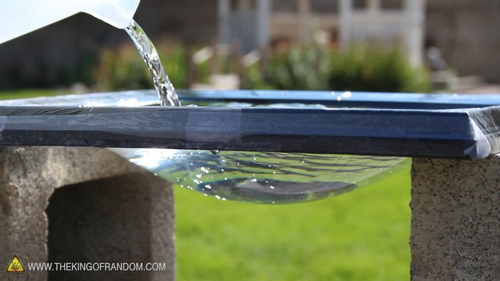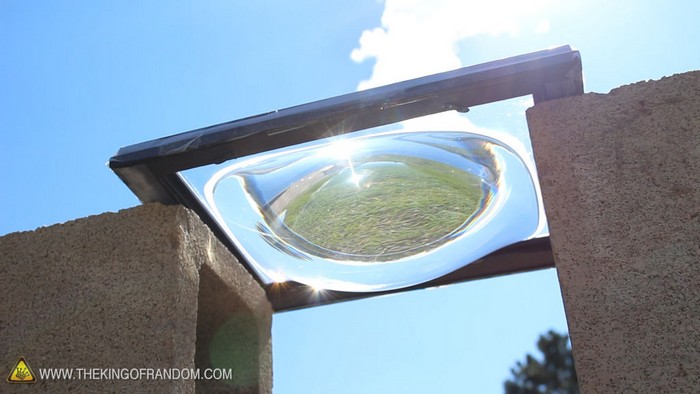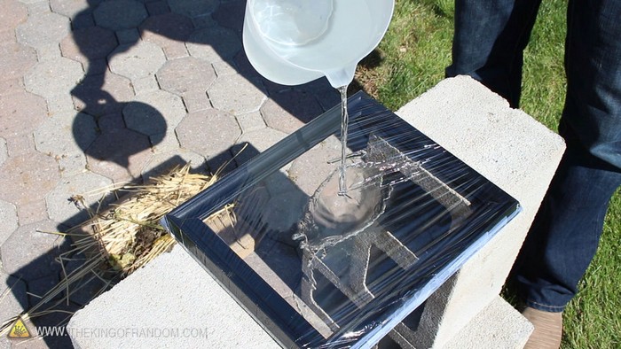 Возьмите рамку для фото большого формата и накройте её плотно пищевой плёнкой. Разместите конструкцию на расстоянии около полуметра над землей. Аккуратно наливайте сверху воду, чтобы пленка естественным образом прогнулась. Не то линза, не то арт-объект.