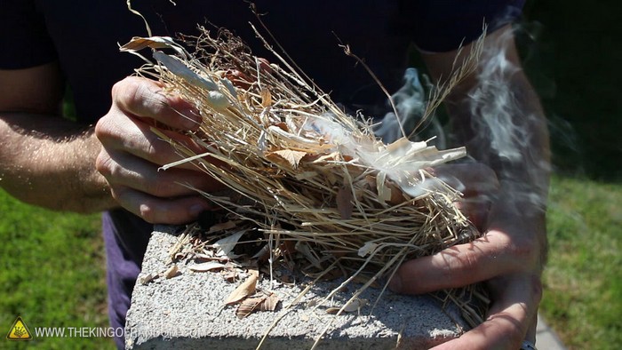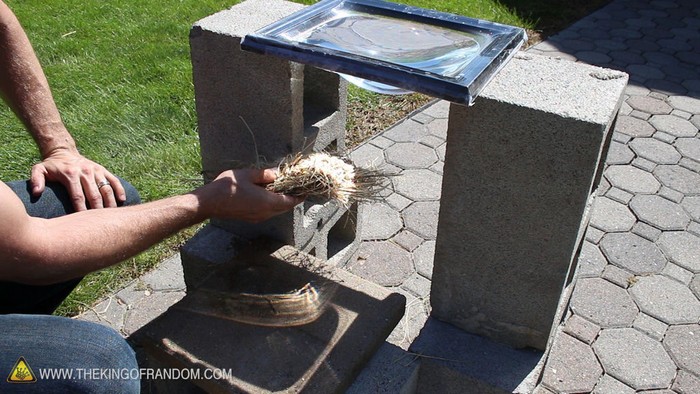 Поставьте втулку на основу, а сверху положите сухую траву. Аккуратно подлейте в крышку с карбидом кальция одну чайную ложку воды и отходите. Костёр разгорится в считанные секунды.