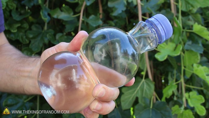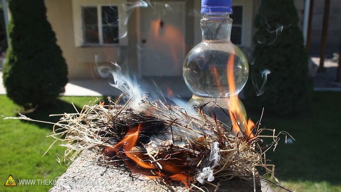 Отправляясь в поход, отдайте предпочтение воде в шарообразной пластиковой бутылке. Или перелейте её в подобный контейнер. Ведь так импровизированная линза всегда будет под рукой. Главное, правильно направить солнечный свет и не оставлять бутылку на солнце, когда не планируете готовить ужин. Чревато пожаром.