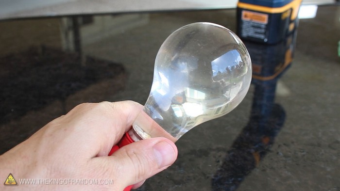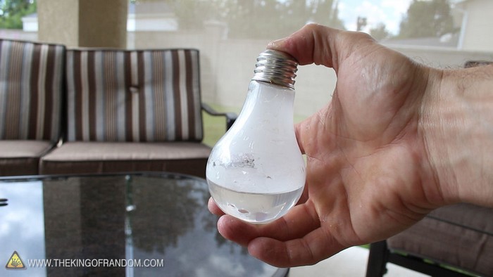 Возьмите неработающую лампочку и открутите её цоколь. Теперь налейте вовнутрь немного горячей воды и хорошенько, долго потрясите. Вы заметете, как белое покрытие начнёт сходить. Этот «эффект шара со снегом» вам и нужен. Повторите процедуру несколько раз, пока лампочка не станет кристально чистой.