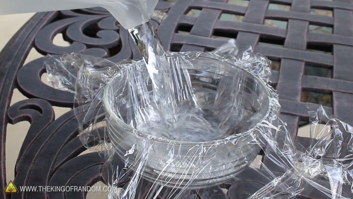 Возьмите любую миску или глубокую пластиковую тарелку. Постелите внутри фрагмент пищевой пленки, чтобы он повторял форму ёмкости.