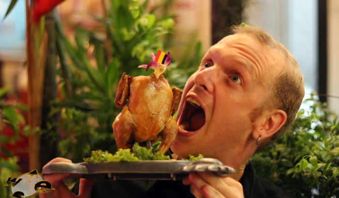 В ресторане Flying Chicken в Бангкоке можно увидеть сцену, в которую тяжело поверить. Когда в нем заказывают жареную курицу, то ее подают очень необычным способом. На сцену на одноколесном велосипеде выкатывается официант в шлеме с шипом. Затем уже приготовленную курицу поджигают и выстреливают в воздух с мини-катапульты. Официант же ловит ее на шип на своем шлеме, после чего привозит птицу за столик.