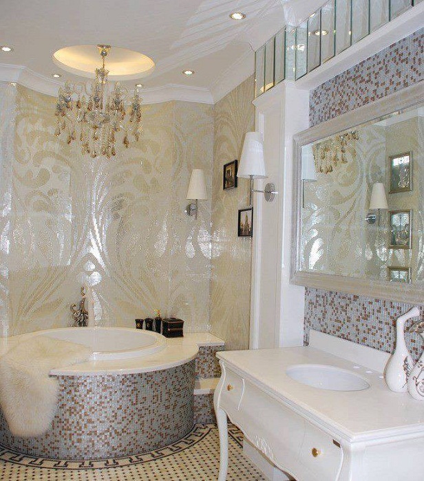 Прекрасный вариант декорировать ванную комнату при помощи симпатичной мозаики, что однозначно преобразит интерьер.