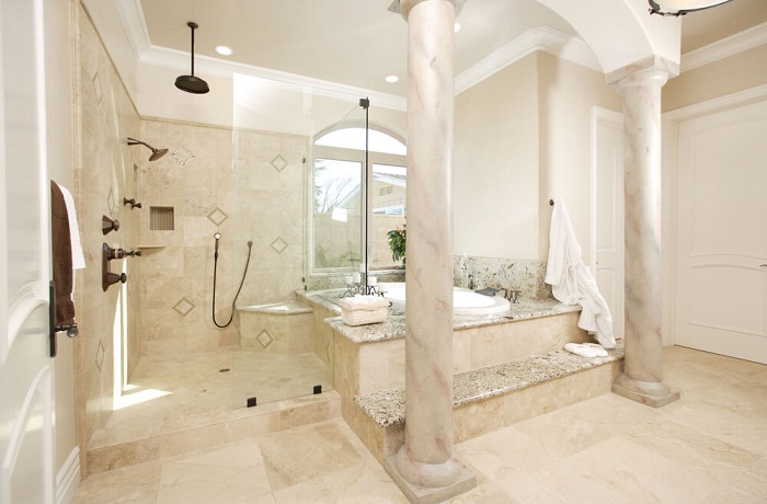Красивый и незабываемый интерьер в ванной комнате создан благодаря оформлению её в мраморных текстурах.