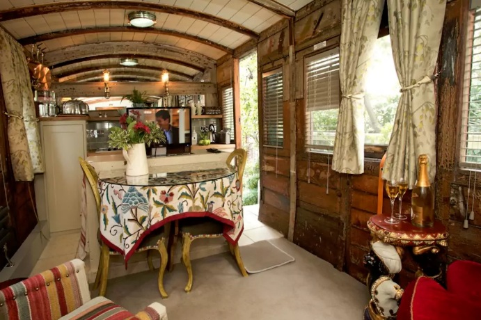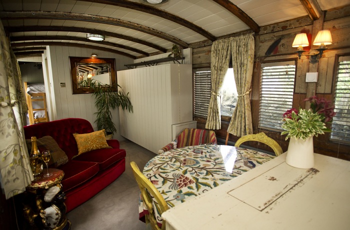 Внутри вагона находится одна большая кровать (при необходимости можно «спрятать») и одна двухъярусная. Обеденный стол, диван, занавески – все это создает дух викторианской эпохи. Но, чтобы отдыхающие не чувствовали себя дискомфортно, в отеле достаточно и современных вещей (HD TV / DVD, бесплатный Wi-Fi).