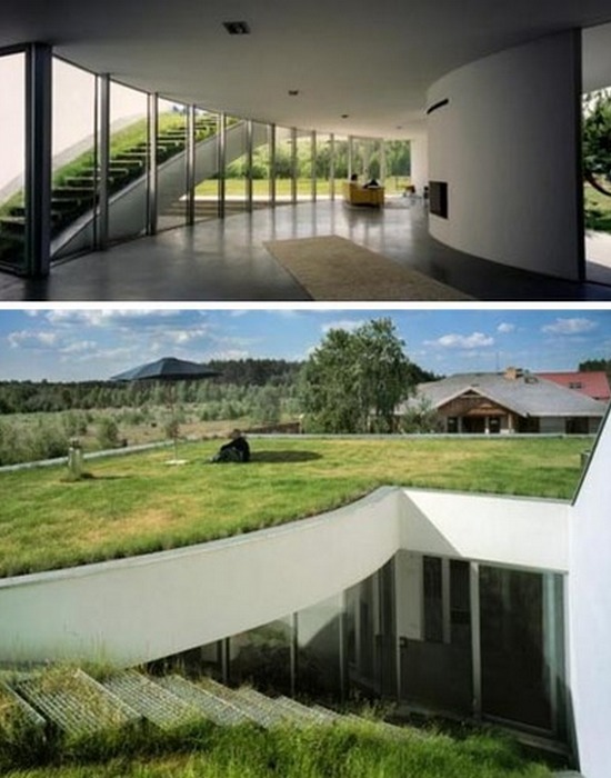 Этот подземный дом был разработан компанией КВК Promes. Он отличается тем, что его покрытая травой крыша переходит в ступеньки (также покрытые травой), ведущие к входной двери.