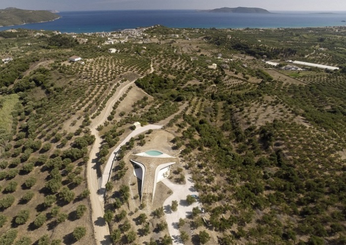 Посреди идиллического пейзажа в оливковой роще на греческом полуострове Пелопоннес появилась необычная вилла. Вернее, если не фокусировать внимание, то ее можно и не заметить, т. к. строение идеально интегрировано в искусственный холм.